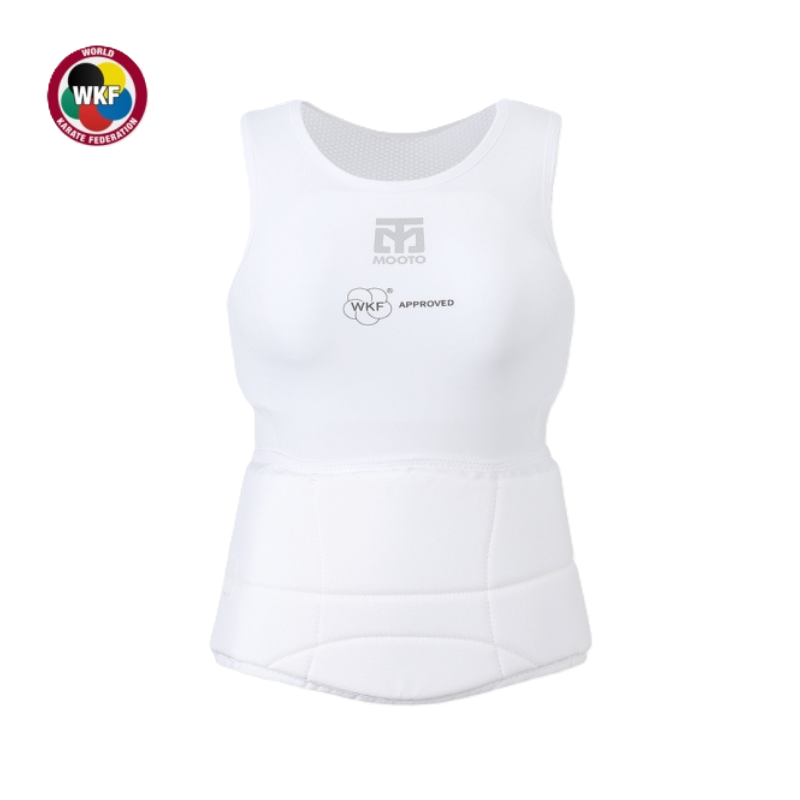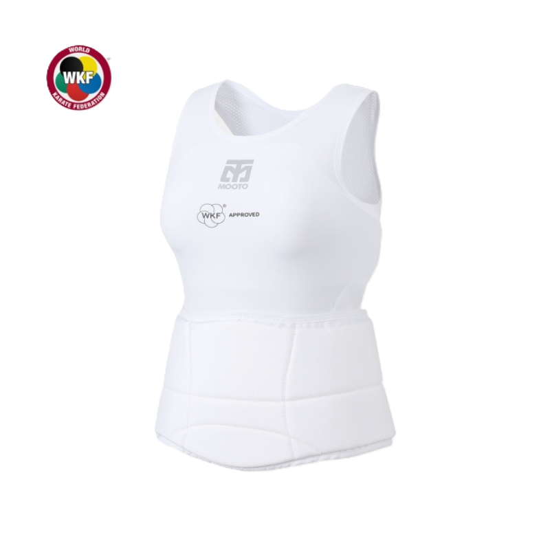 Mooto WKF approved karate female chest guard set is an official competition-level protective set specifically designed for female karate practitioners, offering both a breast guard and an abdomen guard for comprehensive torso protection.